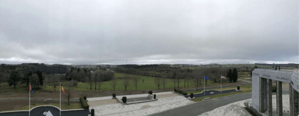 Our first stop was a private memorial that commemorated the actions of American soldiers who fought back the German offensive attack on Bastogne. The first photo is an aerial view of the center of the monument. The second is a view of the surrounding areas from the top of the monument. Our program director Jerry is in the president of an organization that is currently in the process of repairing the monument.